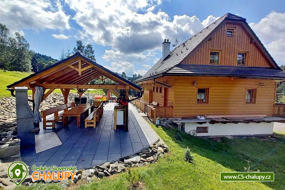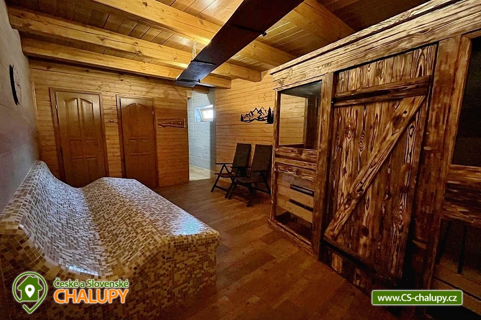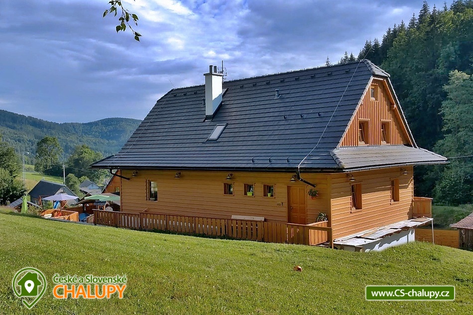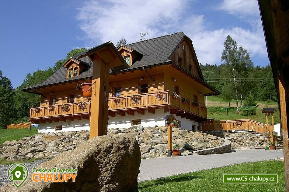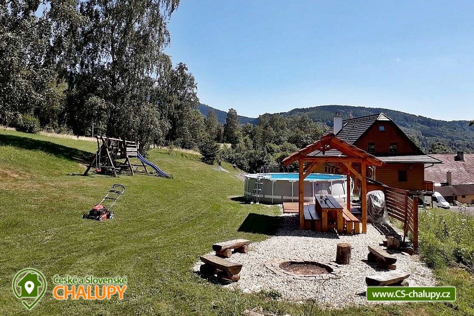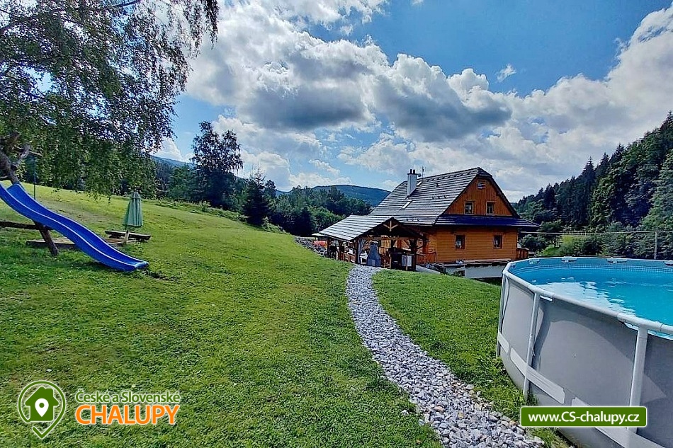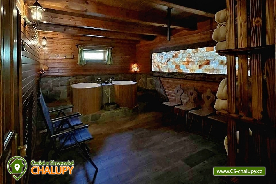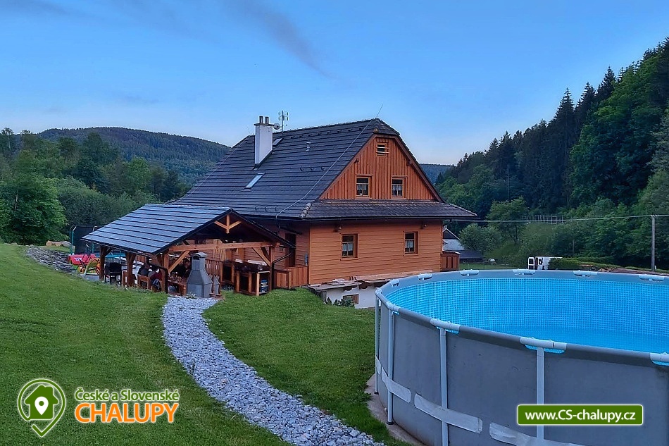 Wellness roubenka s bazénem uprostřed krásné přírody na úpatí Hrubého Jeseníku. Údolí v CHKO Jeseníky obklopují vrcholy Břidličné, Mravenečníku a Dlouhých Strání, protéká jím říčka Merta a nejvyšším bodem území je Jelení hřbet s nadmořskou výškou 1367 m. Chalupa k pronajmutí poskytuje ubytování pro až 20 osob v 7 ložnicích. POPIS - Suterén: wellness - sauny, vířivka, koupací kádě, vyhřívané lůžko. Přízemí: kuchyně, jídelna, společenská místnost, dětský koutek, 1x3 lůžkový pokoj. 1.patro: 2x3 lůžkový pokoj, 1x4 lůžkový pokoj, 1x apartmán 7 lůžek ve 3 ložnicích (2 v podkroví) - tento apartmán má jeden pokoj průchozí do podkroví s dvěma menšími pokojíky vhodnými především k přespání a neposkytuje plně soukromí pro více rodin. Kuchyň je prostorná, plně vybavená, nechybí sklokeramická deska, el. trouba, mikrovlnná trouba, fritéza, myčka nádobí, dva dřezy, koše na tříděný odpad, el. kráječ, mixér, topinkovač, toastovač, 3 lednice včetně mrazáku, 3 rychlovarné konvice, kvalitní nože, příbory, nádobí, nerez hrnce, termomísy, ... a nemusíte vozit cukr, mouku, sůl, pepř + základní koření, nachystáme Vám utěrky, houbičky i jar. Jídelna s dveřmi na terasu plnou venkovního posezení, výhledem a vůní lesa, masivním barem s výčepem, bytelné židle TON z ohýbaného buku. Sociální zařízení: Celkem 5x koupelna, 7x WC, každý pokoj s vlastním soc. zařízením - sprchový kout, WC, ručníky + osušky pro každé lůžko, mýdlo, fén. Vytápění: Bezobslužný provoz automatického kotle + kotel na dřevo, cena topení je zahrnuta v celkové ceně za pobyt. Dále: Venkovní bazén, slunečníky, ohniště, 2x gril, průlezky, stoly, lavice, křesla, lehátka, skiboxy, kolárna. Letní kuchyně ve velkém přístřešku s terasou a zázemím pro příjemný pobyt pod širým nebem, vybavená dřezem s teplou vodou, varnou deskou a lednicí. Eellness v suterénu chalupy s dvěma nezávislými vchody - pro ubytované hosty a obsluhu wellness. Součástí jsou 2 sauny, 2 koupací kádě, vířivka, vyhřívané lůžko, solná stěna. Po celou dobu pobytu je zaručena čistota, hygiena, výměna osušek, prostěradel a dek. Wellness je určený pouze pro hosty tohoto objektu a sousedního objektu 2M-336 stejného majitele. V létě Jeseníky otevřou své poklady všem: příroda, památky, lázně, technické unikáty, kultura, sport, odpočinek. Doporučujeme Termály Velké Losiny - nový Therme park s léčivou vodou, 9 bazénu uvnitř i venku. V zimě na lyžích ze sjezdovky až k chalupě - to je lyžovačka ve skiareálu Brněnka (200 m skibusem ke sjezdovce a dolů po urolbované cestě až k chalupě - pohodová atmosféra). Těšíme se na Vás u nás.